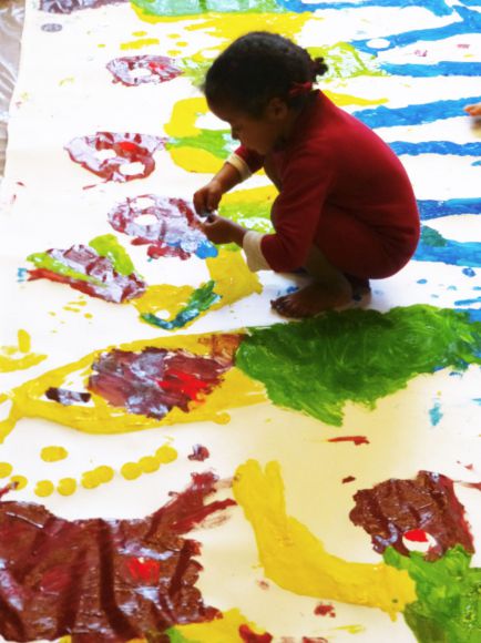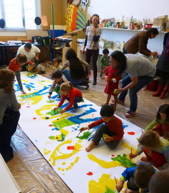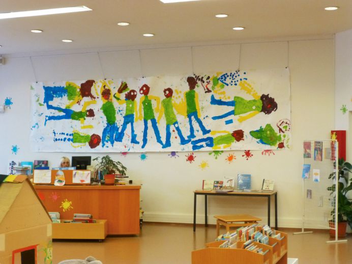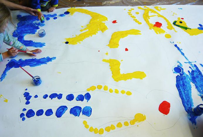 Après avoir lu l’album, nous avons réalisé une grande fresque. Tous les enfants se sont allongés sur une grande feuille posée au sol et ont tracé le contour de leur silhouette. Ensuite, à la peinture ils ont donné vie à leur personnage.